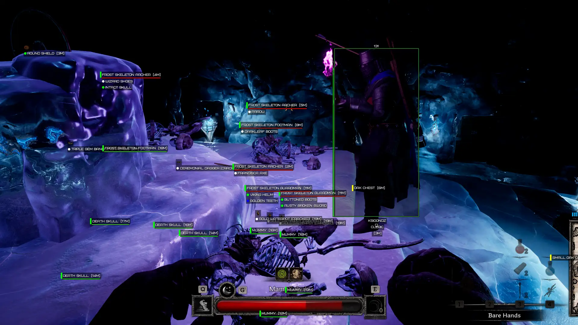 Mobs ESP allows you to see various enemies — from skeletons and goblins to mimics and living statues. It displays health, distance, and monster corpse loot.